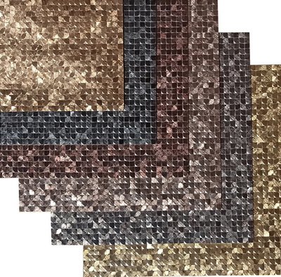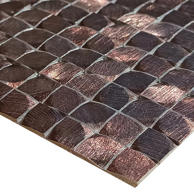 aluminum alloy mosaic tile, brushed, stained coffee, wall tile, no joint space, no grout needed, optional mesh mounted and self-adhesive (peel and stick) versions, various colors available.
