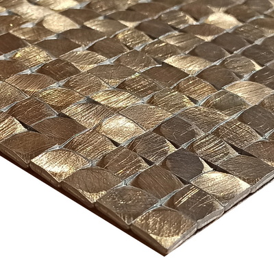 aluminum alloy mosaic tile, brushed, stained gold, wall tile, no joint space, no grout needed, optional mesh mounted and self-adhesive (peel and stick) versions, various colors available.