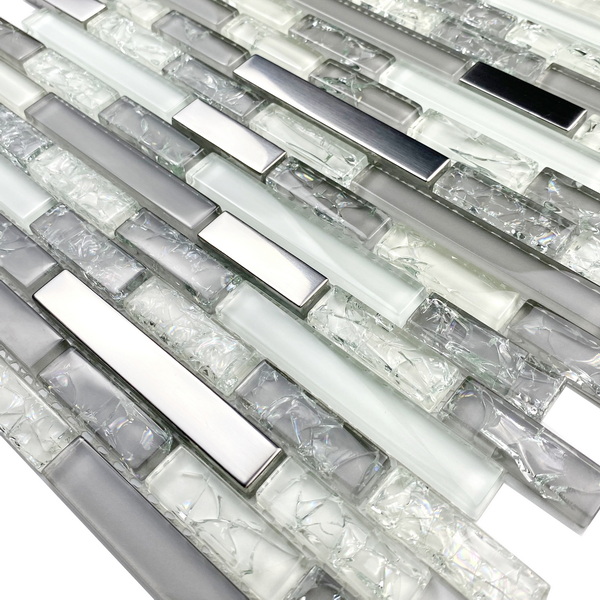 Crystal glass mosaic tile, linear tile, a combination of glass, ice crackled glass and electroplated glass with a light brushed texture feel looking like stainless steel.