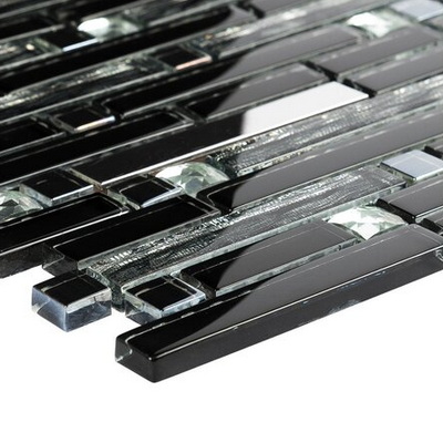 Mixed materials mosaic tile of silk textured shimmer foil glass, diamond glass, crystal glass and stainless steel.