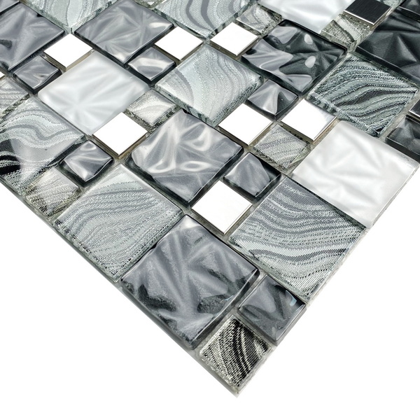 Mixed materials mosaic tile, a combination of shimmer foil glass tile, metallic powder glass decorative pieces and stainless steel tile.