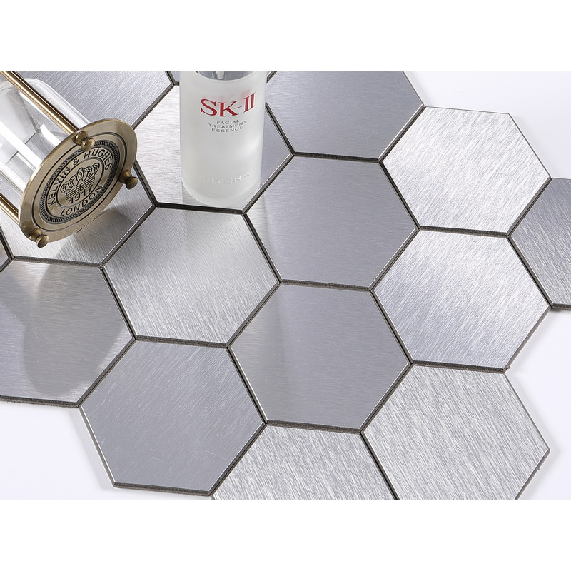 peel and stick 3 inch hexagon aluminum composite tile, silver, brushed, bevel edges.