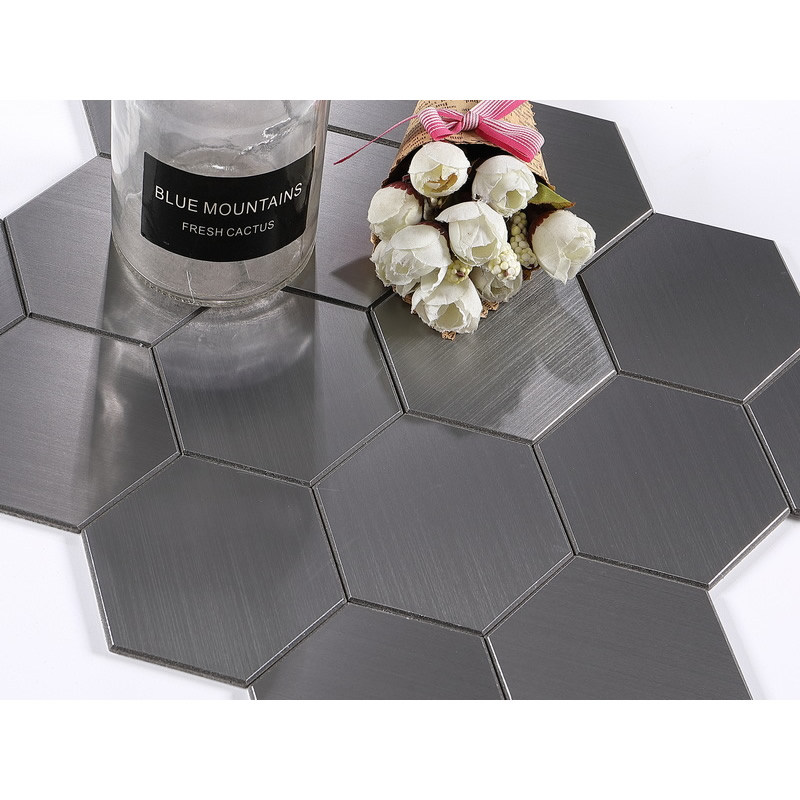 peel and stick 3 inch hexagon aluminum composite tile, iron grey, brushed, bevel edges.