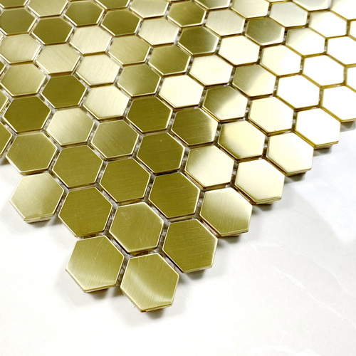 Stainless steel mosaic tile, hexagon tile, gold color, glossy finish with slight brushed texture #stainless steel tile #metal tile #random brick tile #wall tile #backsplash tile #bathroom tile # kitchen tile. This series of metal tiles are made by Xmosaics Foshan factory, a reliable mosaic tile manufacturer, supplier and exporter.