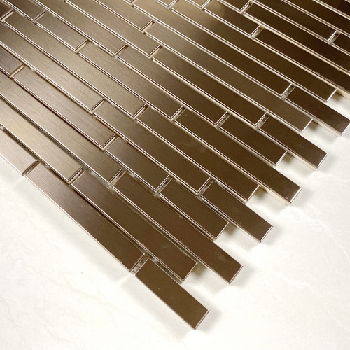 Stainless steel mosaic tile, linear tile, copper color, glossy finish with slight brushed texture #stainless steel tile #metal tile #random brick tile #wall tile #backsplash tile #bathroom tile # kitchen tile. This series of metal tiles are made by Xmosaics Foshan factory, a reliable mosaic tile manufacturer, supplier and exporter.