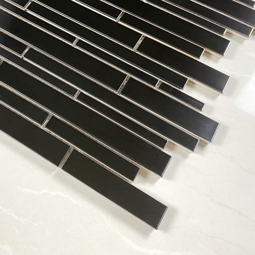 Stainless steel mosaic tile, random brick tile, black color, glossy finish with slight brushed texture #stainless steel tile #metal tile #random brick tile #wall tile #backsplash tile #bathroom tile # kitchen tile. This series of metal tiles are made by Xmosaics Foshan factory, a reliable mosaic tile manufacturer, supplier and exporter.