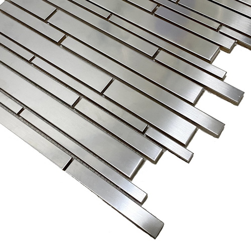 Stainless steel mosaic tile, random brick tile, silver color, glossy finish with slight brushed texture #stainless steel tile #metal tile #random brick tile #wall tile #backsplash tile #bathroom tile # kitchen tile. This series of metal tiles are made by Xmosaics Foshan factory, a reliable mosaic tile manufacturer, supplier and exporter.